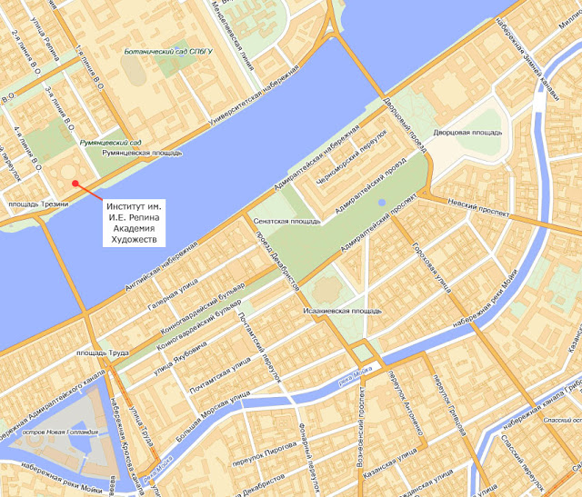 Автомобиль: из центра через Невский проспект выехать на Дворцовый мост, повернуть налево, следовать вдоль Университетской набережной. Здание Академии находится сразу за Румянцевским садом. Вход со стороны набережной.